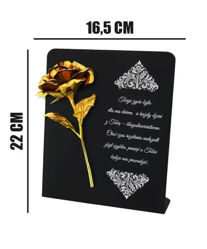 Tabliczka pamiątkowa z różą marki Wieczne Znicze to wyjątkowa ozdoba nagrobna, która w elegancki i subtelny sposób upamiętnia bliską osobę. Łączy prostotę i elegancję, a dzięki wzruszającej sentencji staje się symbolem miłości i pamięci, który na długo pozostaje w sercu.